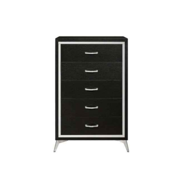 The Huxley Chest is a sleek and sophisticated addition to any bedroom. With an embossed black overlay, it exudes a modern and luxurious feel. This piece features center drawer glides and English dovetail drawers for smooth operation and durability.